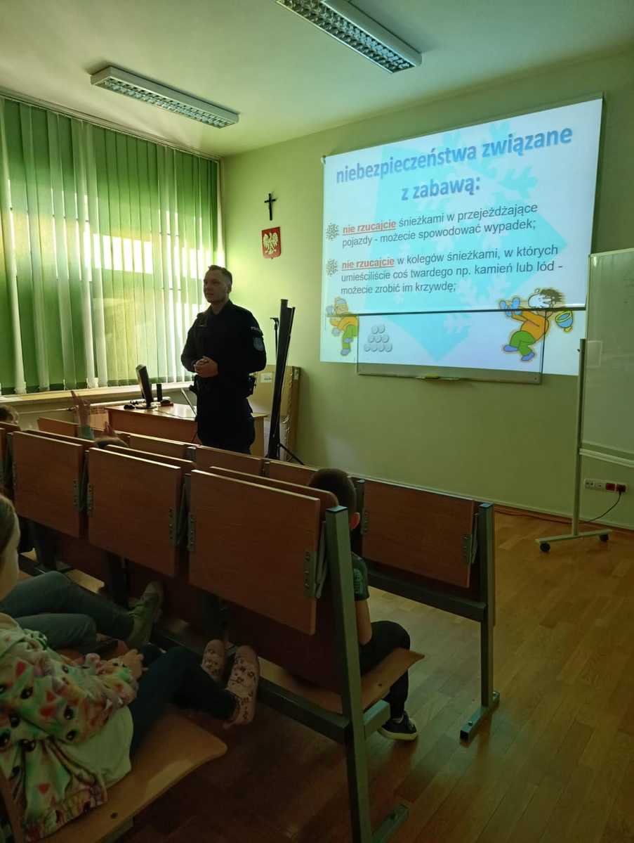 W ramach działań profilaktyczno-prewencyjnych „Bezpieczne Ferie 2026”, w dniu 20 stycznia 2026 roku dzielnicowy Komisariatu Policji Tarnów-Centrum – mł. asp. Marcin Kiwior przeprowadził prelekcje dla uczniów Szkoły Podstawowej im. H. Marusarz w Pogórskiej Woli.